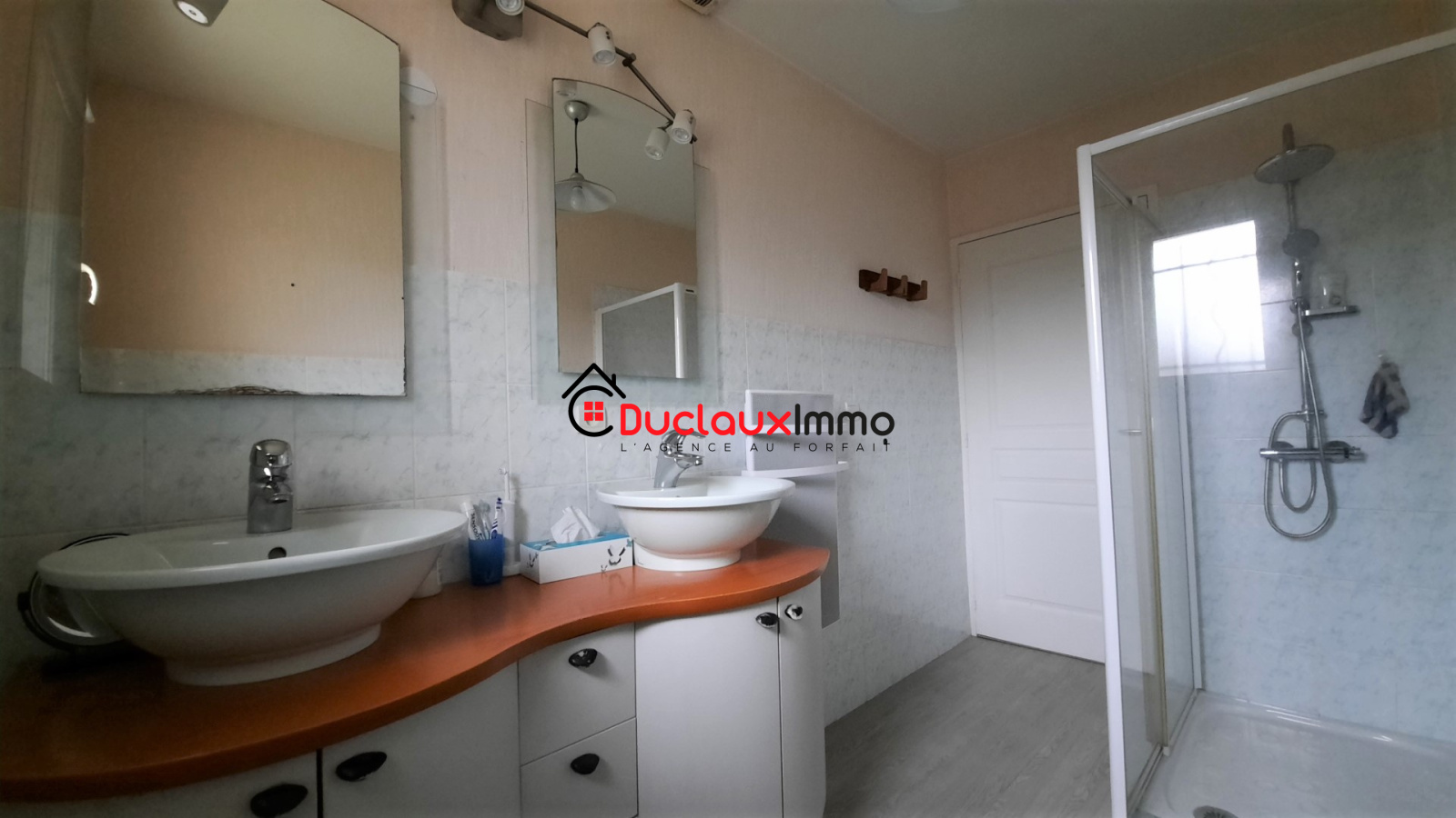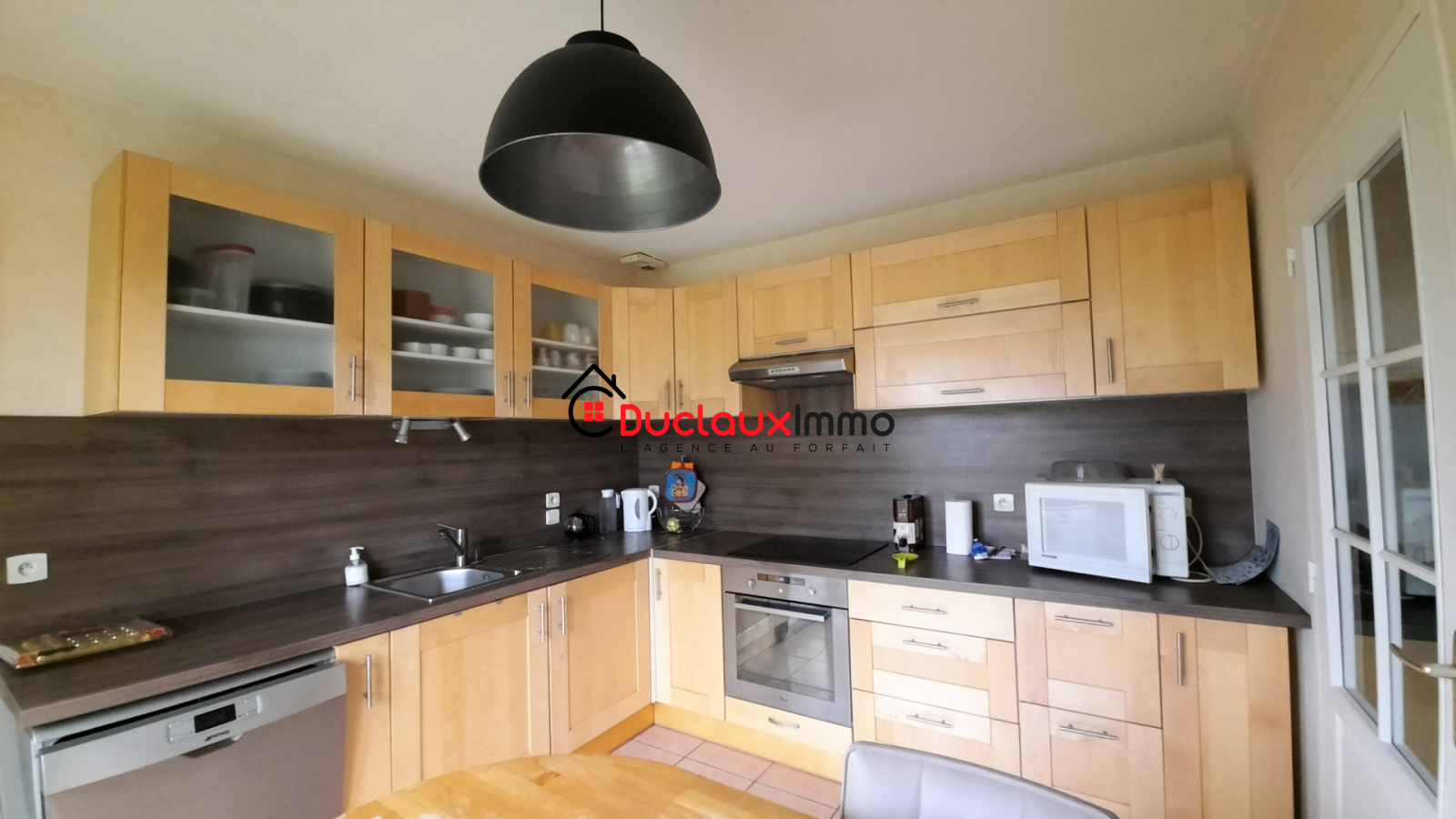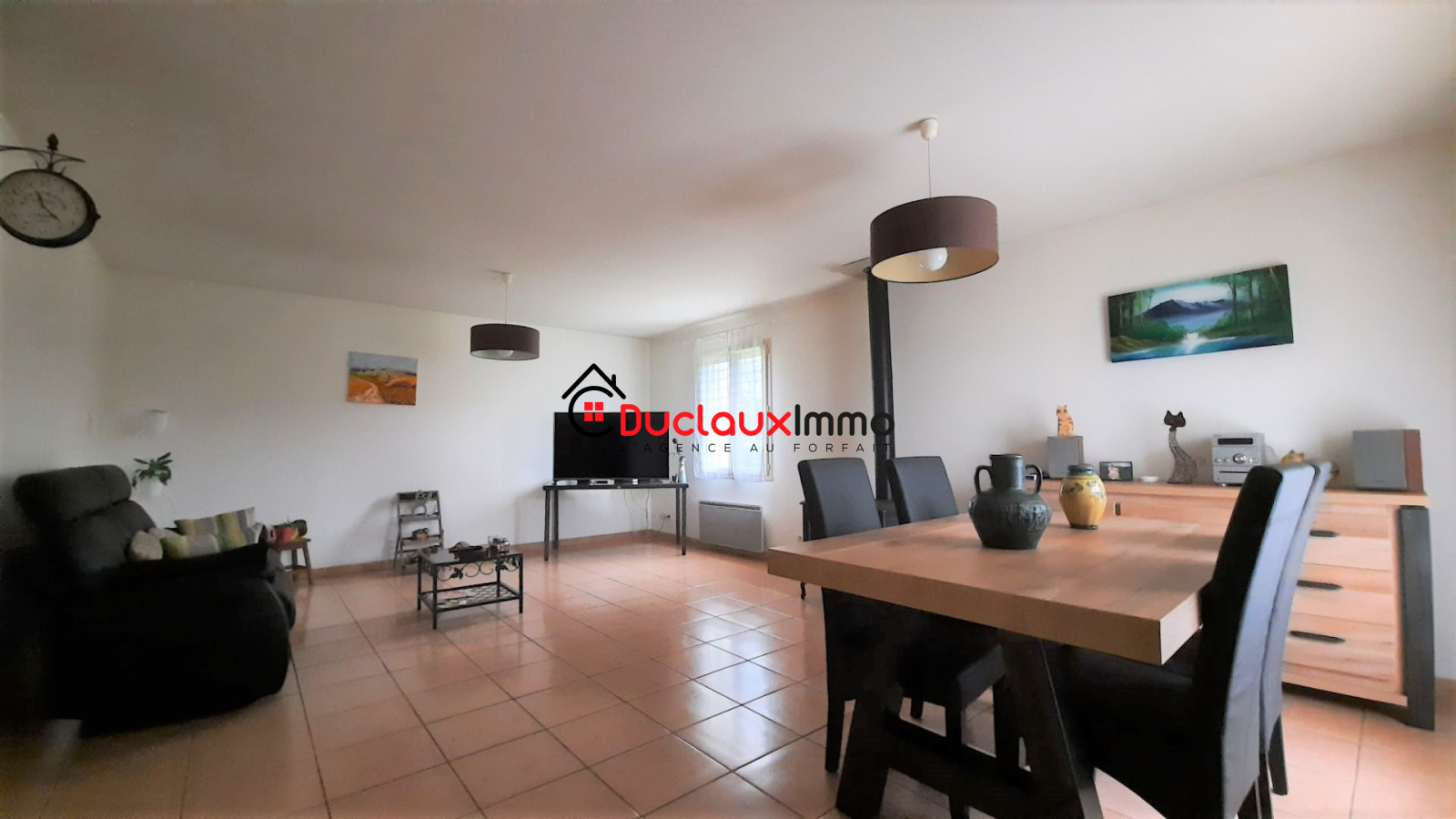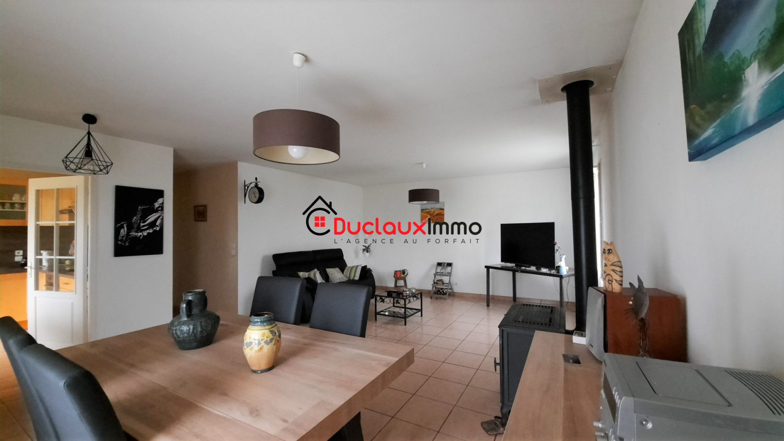 Grande pièce de vie avec poêle à bois, cuisine séparée équipée attenante avec cellier, 3 chambres, salle d'eau, Wc séparés, garage avec buanderie.