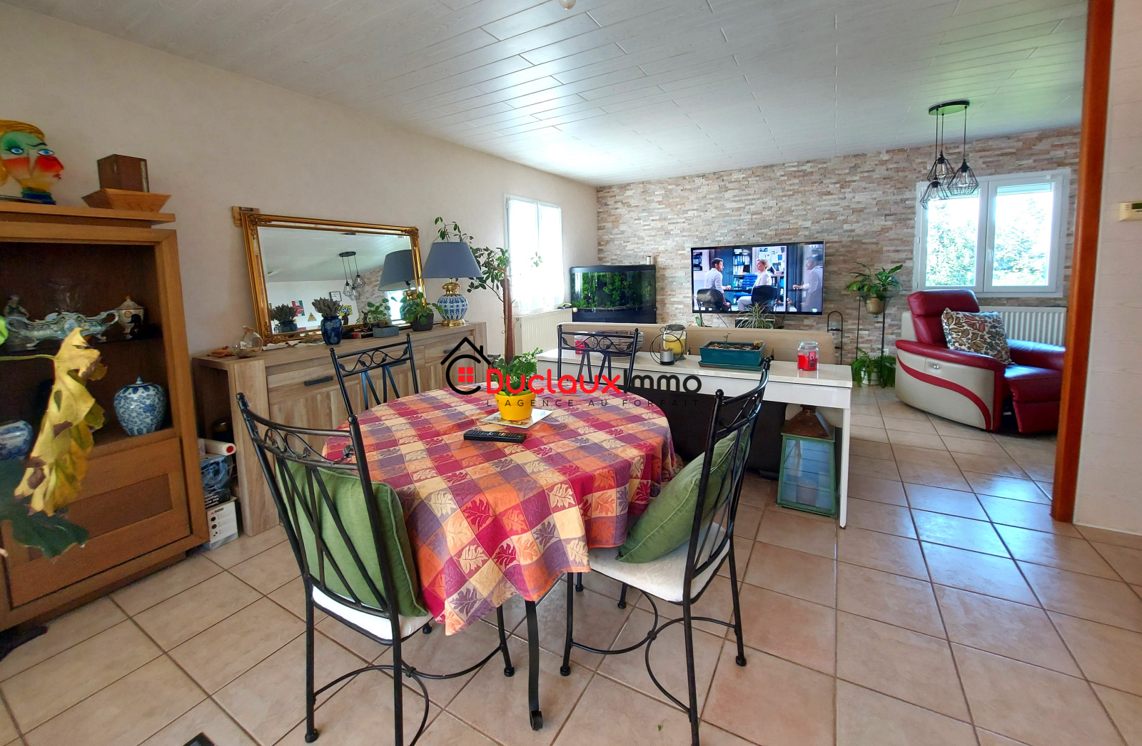- De plain-pied : d'une grande véranda ouverte sur un salon/salle à manger lumineux équipé d'un insert bois, d'une cuisine équipée, de deux chambres, d'une salle d'eau avec douche à l'italienne et d'un WC séparés.